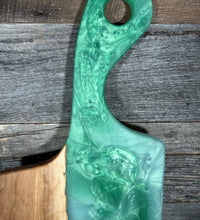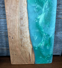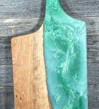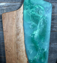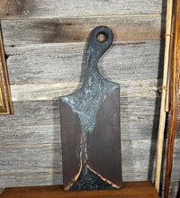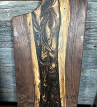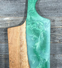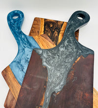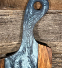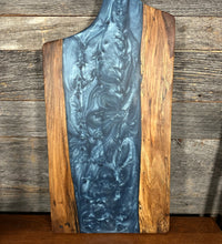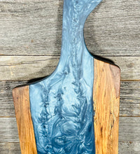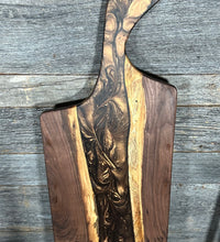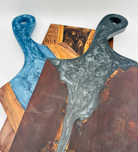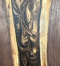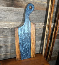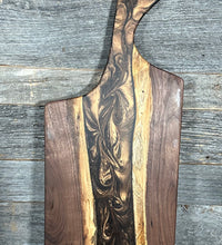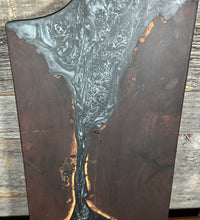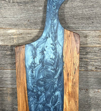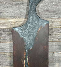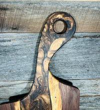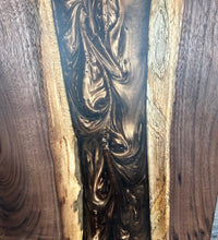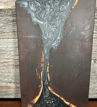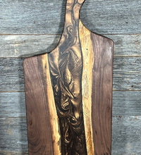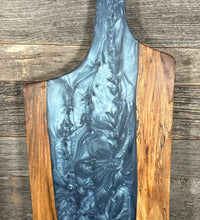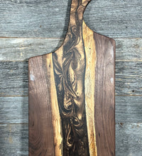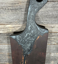 Make an unforgettable statement with this dramatic and sophisticated serving board. This piece combines the deep, rich tones of Black Walnut Wood with a mesmerizing shimmering resin. The result is a stunning, high-contrast look perfect for modern, industrial, or elegant farmhouse settings. This board is expertly crafted in a functional paddle style, featuring a resin-encased handle for easy serving and display. The dark wood section showcases the natural grain, while the shimmering resin flows in an artful swirl, extending from the main body and fully forming the sturdy handle. the visual effect is luxurious and unique. The sweeping curve of the handle allows for easy hanging and display when not in use. Perfect for hosting, this piece is ideal as a charcuterie board, cheese board, appetizer platter, or a decorative centerpiece. It makes an incredible, one-of-a-kind gift for weddings, housewarmings, or anyone who loves unique home decor. This board is perfectly sized to serve a generous spread of cheese, crackers, appetizers, or desserts. It also makes a fantastic decorative piece for your kitchen, dining room, or coffee table. This one-of-a-kind creation measures 11X29.5X1.25 inches and weighs 8lbs 12oz, offering ample space for an array of culinary delights. Bring a touch of modern elegance to your kitchen or dining room with this stunning charcuterie board.