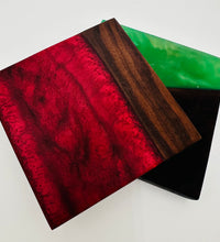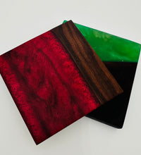 Elevate your home decor and protect your surfaces with these exquisite Handcrafted Black Walnut and Resin Coasters. Each coaster is a unique blend of natural black walnut wood, celebrated for its rich, deep tones and distinctive grain patterns, pared with a vibrant, high-gloss resin. The dynamic resin colors contrasts with the organic warmth of the wood, creating a functional piece of art for you home. Perfect for protecting tables from condensation while adding a touch of sophisticated, modern design. Sold as a set of four and individually handcrafted for a unique gift or stunning addition to you own living space. Available in several color schemes - Dark Gray, Red and Gold Swirl, and Bonsai Green