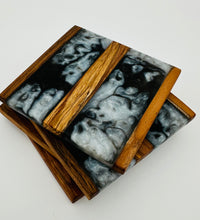 Set of four handcrafted resin coasters. Each coaster features a striking combination of deep resin contrasted with a jockey silk...