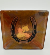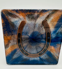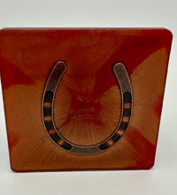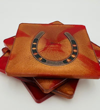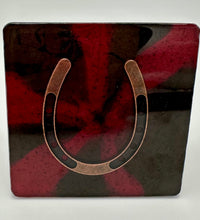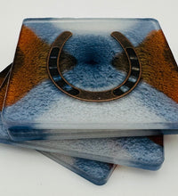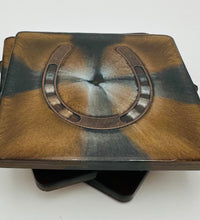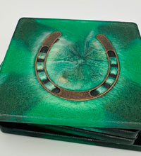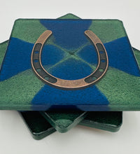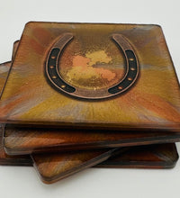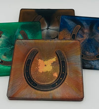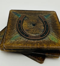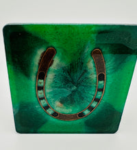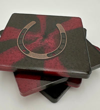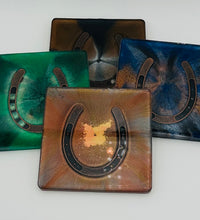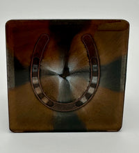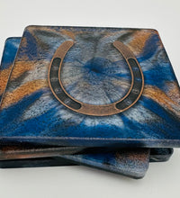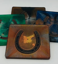 Elevate your home décor with this set of four handcrafted resin coasters, each featuring a captivating horseshoe inlay. These aren't just functional accessories; they're a statement piece, reflecting a passion for equestrian style and a touch of rustic charm. The set of coasters are hand poured in our studio. Horseshoes are inlaid in each coaster. Coaster is backed with cork. Approximate size - 5 inches round, 1.5 lbs