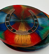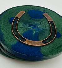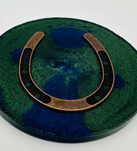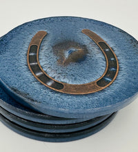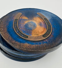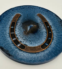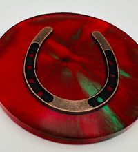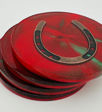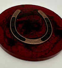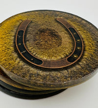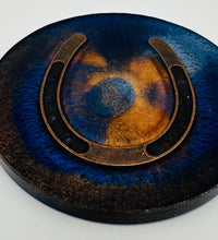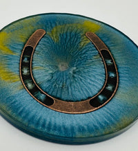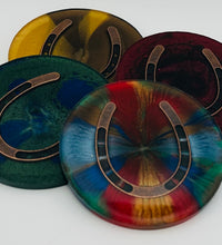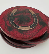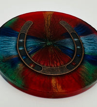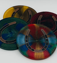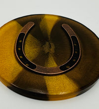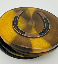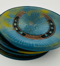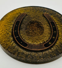 The antique brass bridle bit inlay is not merely a flat design. It's an actual metal horseshoe, carefully embedded within the resin to create a three-dimensional element that catches the light and draws the eye. The aged, vintage look of the antique brass adds a touch of rustic charm, contrasting beautifully with the smooth, polished resin. This unique combination of materials makes these coasters truly special. The set of coasters are hand poured in our studio. Antique Brass Horseshoes are inlaid in each coaster. Coaster is backed with cork. Approximate size - 5 inches round, 1.5 lbs All are hand poured and will vary in look slightly.