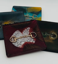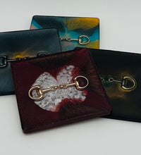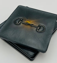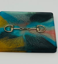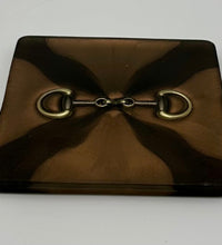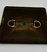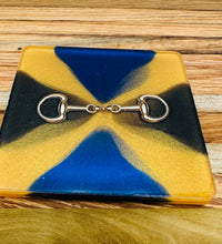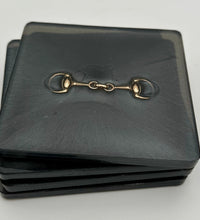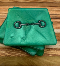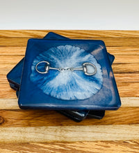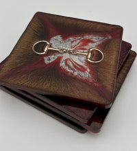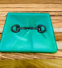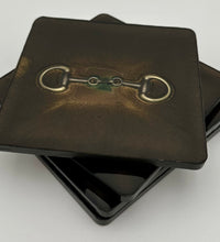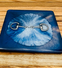 The bridle bit inlays are not merely decorative accents. They are actual metal bridle bits, carefully selected and positioned within the resin to create a three-dimensional effect. This adds depth and texture to the coasters, making them visually appealing and unique. The gleaming gold of the bridle bit contrasts beautifully with the cool silver resin, creating an eye-catching interplay of materials.The set of coasters are hand poured in our studio. Horse bridle bits are inlaid in each coaster. Coaster is backed with cork. Approximate size - 5 inches square, 1.5 lbs