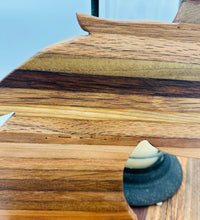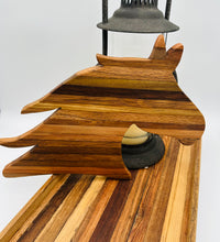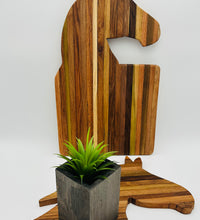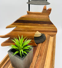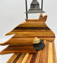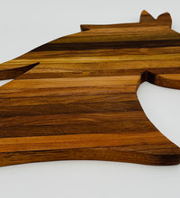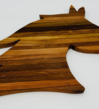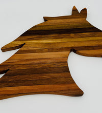 A stunning, multi-tonal cutting board crafted from repurposed tobacco sticks, shaped into the elegant profil of a horse head. Perfect for the equestrian lover! Use it as a unique charcuterie platter, serving tray, or a rustic piece of kitchen wall art. Each board features unique wood grain.