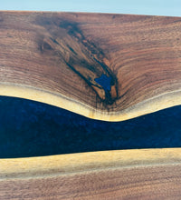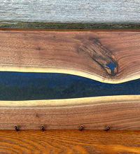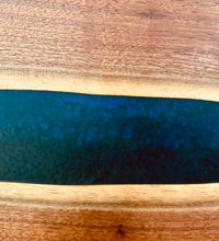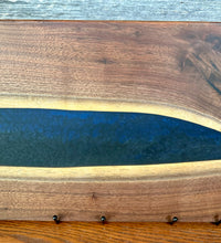 This handcrafted charcuterie board is a striking statement piece. The rich tones of the walnut wood are dramatically contrasted by a deep blue resin inlay, creating a truly unique and eye-catching piece. Its sturdy construction and smooth finish ensure years of enjoyment. This one-of-a-kind creation measures 11x22x.5 inches and weighs 5lbs 13oz, offering ample space for an array of culinary delights. Bring a touch of modern rustic elegance to your kitchen or dining room with this show-stopping charcuterie board.